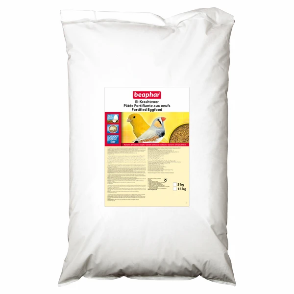 Beaphar Eikrachtvoer Kanarie – Vogelvoer – 15 kg direct bestellen in onze webshop! Eivoer Ei-krachtvoer dient als extra voeding naast het zaadmenu. Het bevat alle noodzakelijke voedingsstoffen – in natuurlijke vorm – die voor vogels van belang zijn om in een goede conditie te blijven en om tijdens de rui een gezond en glanzend verenpak te vormen. Gebruiksaanwijzing Geef Ei-Krachtvoer als 1/4 deel van het dagrantsoen. Het voer kan ruller gemaakt worden door enkele druppels water toe te voegen. Kweekseizoen: 2-3 keer daags geven, behalve de eerste 24 uur nadat de jongen zijn uitgekomen. Ruiperiode: dagelijks toedienen. Tussenperiodes: 2x per week. Beaphar Eikrachtvoer is verkrijgbaar in 150 g, 1 kg en 15 kg. . Alle Beaphar voor uw Vogel uit voorraad leverbaar!
