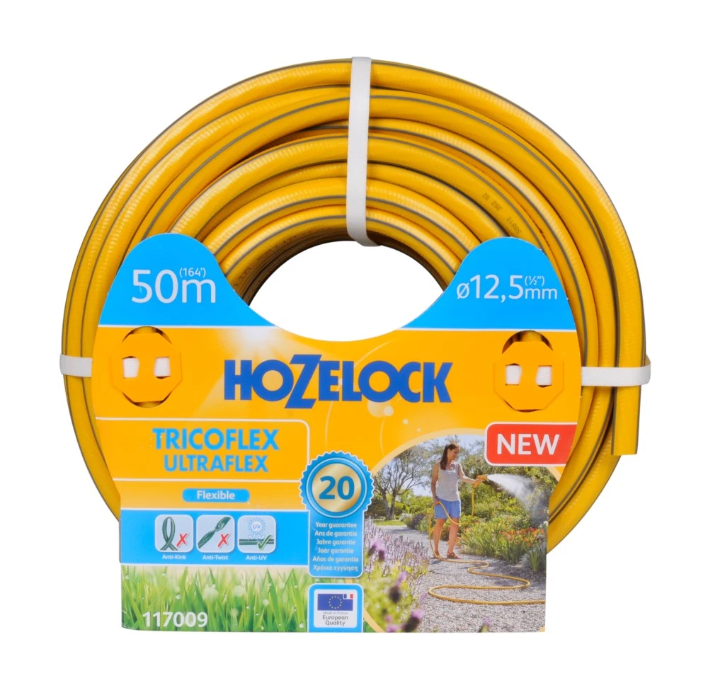Hozelock Tricoflex Ultraflex slang Ø 12.5 mm 50 meter, 50 m, Grijs, Geel, Alleen de slang, PVC, 1,25 cm, Frankrijk Deze soepel, knikvrije en torsievrije tuinslang is vrij van schadelijke weekmakers (Phtalate) en zware metalen en is geschikt voor universeel, dagelijks gebruik. Hozelock Tricoflex Ultraflex slang bestaat uit 5 lagen met een gebreide versterking (soft & flex technologie) en een unieke, door Tricoflex ontwikkelde, extra gladde binnenlaag waarmee drukverlies of verminderde doorstroming over grotere afstand wordt voorkomen. De slang heeft een lengte van 50 meter (Ø12,5 mm) en is ideaal voor grote tuinen. Op alle Tricoflex Ultraflex tuinslang van Hozelock geldt een garantietermijn van 20 jaar.