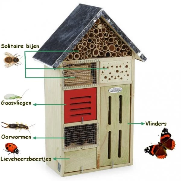 Insecten vervullen vele taken in onze tuinen. Ze bestuiven bijvoorbeeld planten, fungeren als natuurlijke ongediertebestrijders en vormen zo een belangrijk onderdeel bij het biologisch tuinieren. Met dit insectenhotel krijgen tegelijkertijd verschillende soorten insecten de kans om zich te nestelen en te overwinteren. De natuurlijke woonplaats van vele insectensoorten wordt door veranderingen in hun omgeving bedreigd en dit is de manier om ze te helpen en beschermen. Het middelste compartiment biedt bescherming en huisvesting aan groene gaasvliegen, lieveheersbeestjes en oorwormen. De rode kleur van de deur zal in het bijzonder de groene gaasvliegen aantrekken. Bijen verschuilen zich vaak in holle stokjes. Elke bij heeft een ander formaat gat (of buis) nodig. De metselbij kiest een diameter tussen de 3 en 7 mm, terwijl de maskerbij 2 tot 4 mm prefereert. Wilde bijen bedekken hun buizen met leem. De gaten in het hout kunnen voor vele insecten als nest dienen.
