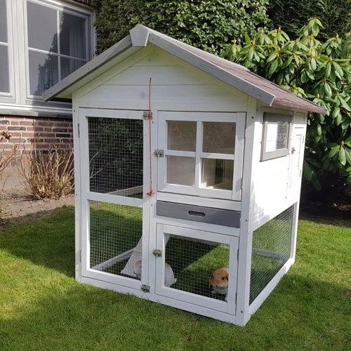 Konijnenhok Cottage – met grote buitenren en nachthok – Afmetingen: 105 x 105 x 110 cm.Modern, kwalitatief en zeer praktisch konijnenhok met een ruime buitenren en een groot nachthok. De voorkant van het hok heeft maar liefst 3 deuren: een grote deur naar de ren, een deur naar het binnenverblijf en een kleinere deur naar ren onder het nachthok. Aan de rechter zijwand zit een ruime deur naar het nachthok. Op deze manier kunt u uw dier altijd goed bereiken en is het hok makkelijk schoon te maken. Het nachthok is voorzien van een toegangsdeur naar de ren, die je kunt afsluiten met een deurtje.Het binnenhok is voorzien van een uitneembare metalen schuiflade voor optimale hygiëne en een afsluitbaar ventilatierooster.