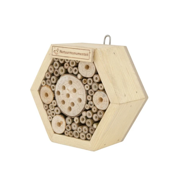 Natuurmonumenten Insectenhuis Zeshoek – Nestkast – 8x16x16 cm Small direct bestellen in onze webshop! Dit product is ontwikkeld in samenwerking met Natuurmonumenten. Gevuld met bamboe en rond hout is dit insectenhuis ideaal voor solitaire bijen en andere insecten zoals oorwormen en kevers. Ook voor spinnen vormt dit insectenhuis een prima onderkomen. Het nestkastje in het midden is zeer geschikt voor hommels. Fraai vormgegeven, degelijk uitgevoerd in vurenhout en afgewerkt met een blanke lak op waterbasis. Insecten zijn onmisbaar in de natuur. Zo helpen bijen bij de bestuiving van planten, kruiden en fruitbomen. Door dit Insectenhuis te plaatsen helpt u ze van daaruit hun nuttige werk te doen. Plaats het Insectenhuis op een zonnige plek in de buurt van bloeiende planten.. Alle Natuurmonumenten voor uw Buiten(Dieren) uit voorraad leverbaar!