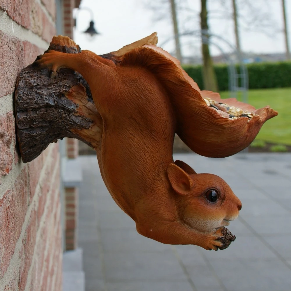 Deze leuke eekhoorn hangt ondersteboven aan een tak met zijn grote uitwaaierende staart in de vorm van een voederschaal. Vul de schaal met een lekkere zaden en geniet van de tuinvogeltjes die in de staart van de eekhoorn komen eten.