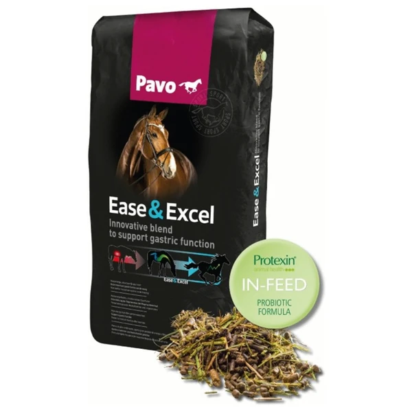 Pavo Ease & Excel – Paardenvoer – 15 kg direct bestellen in onze webshop! Over Pavo Ease&Excel Pavo Ease&Excel is een innovatief sportvoer speciaal ontwikkeld voor een goed zuur-base-evenwicht in de maag en daardoor uitermate geschikt voor sportpaarden die topprestaties moeten leveren. Het is een volledig krachtvoer, hoog in energie uit zeer goed verteerbare vezels en plantaardige olie (lijnzaad- en sojaolie) met daarnaast een zeer laag suiker- en zetmeelgehalte. De Protexin In Feed-Formula Pavo Ease&Excel bevat de unieke Protexin In Feed-Formula: een unieke mix van maagzuur-neutraliserende stoffen, beta-glucanen, Arabische gom en pro- en prebiotica ter ondersteuning van een gezonde maag- en darmfunctie. De ondersteuning in de maag en de dunne darm bestaat uit het neutraliseren van het maagzuur, reguleren van de passagesnelheid en bescherming van de maagwand. De pre- en probiotica ondersteunen de goede darmbacteriën zowel in de dunne- als de dikke darm en zorgen zodoende voor een evenwichtige darmflora. Voermanagement Voor het optimale resultaat is het belangrijk dat je je voermanagement aanpast en naast Pavo Ease&Excel voldoende ruwvoer aanbiedt. Ga voor de minimale ruwvoeropname uit van 1,5% van het lichaamsgewicht in droge stof, verdeeld over zoveel mogelijk maaltijden per dag. Tip: meng Pavo Ease&Excel met Pavo DailyPlus voor het verlagen van de opnamesnelheid en verhogen van de kauwintensiteit.. Alle Pavo voor uw Paard uit voorraad leverbaar!