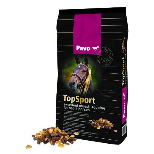 TopSport van Pavo is een muesli voor paarden die actief zijn in de sport vanaf niveau M. Dit voer kan gebruikt worden als aanvulling op het ruw- en krachtvoer. Het bevat een hoog aandeel aminozuren en eiwitten voor een maximale spierondersteuning. Pavo Topsport is verkrijgbaar in een zak van 15 kg.