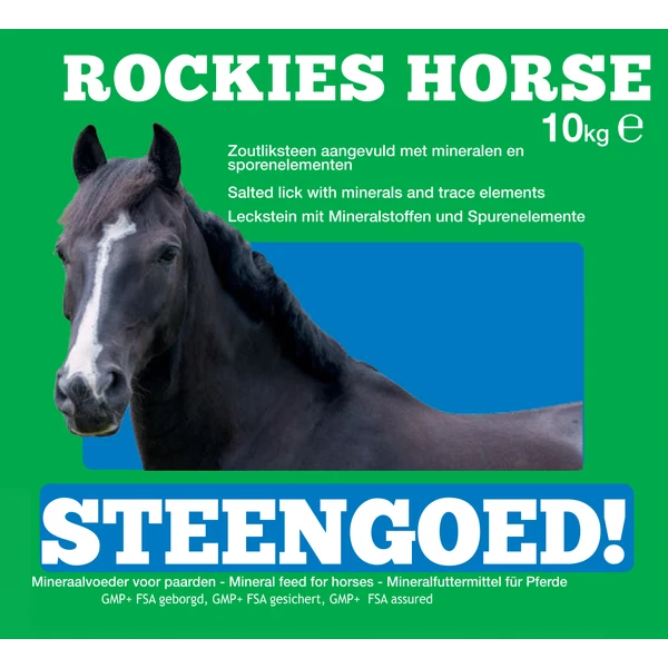 Rockies Liksteen Paard Naturel – Voedingssupplement – 10 kg direct bestellen in onze webshop! Rockies Horse is een belangrijke aanvulling in de dagelijkse behoefte van uw paard. Naast voldoende ruwvoer en een eventuele weidegang heeft een paard dagelijks zout, mineralen en sporenelementen nodig. Rockies Horse heeft een natuurlijke, grijze, kleur. De liksteen voor paarden bevat naast zout, ook magnesium, koper, zink, mangaan, kobalt, jodium, selenium en biotine. De Rockies paardenlikstenen bevatten geen suikers.. Alle Rockies voor uw Paard uit voorraad leverbaar!