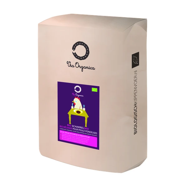 Via Organica Bio Scharrelmix – Kippenvoer – 12.5 kg Bio direct bestellen in onze webshop! Biologisch gemengd kippenvoer – Een biologisch eitje van je eigen kippen! Via Organica voeders voor kippen en kuikens zijn samengesteld uit een rijke variatie grondstoffen van biologische teelt. Deze voeders zijn 100% plantaardig en uiteraard vrij van kunstmatige kleurstoffen en genetisch gemodificeerde zaden. Het ideale voer voor een biologisch ei van je eigen kippen!Via Organica Bio Scharrelmix is een gemengd voer met een middelgrove structuur geschikt voor krielkippen en grote rassen. De gemengde structuur stimuleert het natuurlijke scharrelgedrag. De uitgebalanceerde samenstelling stelt het welzijn van de kippen voorop en biedt de hennen alle noodzakelijke voedingsstoffen voor het leggen van smakelijke eieren met een prachtige natuurlijke dooierkleur.. Alle Via Organica voor uw Boerderijdier uit voorraad leverbaar!